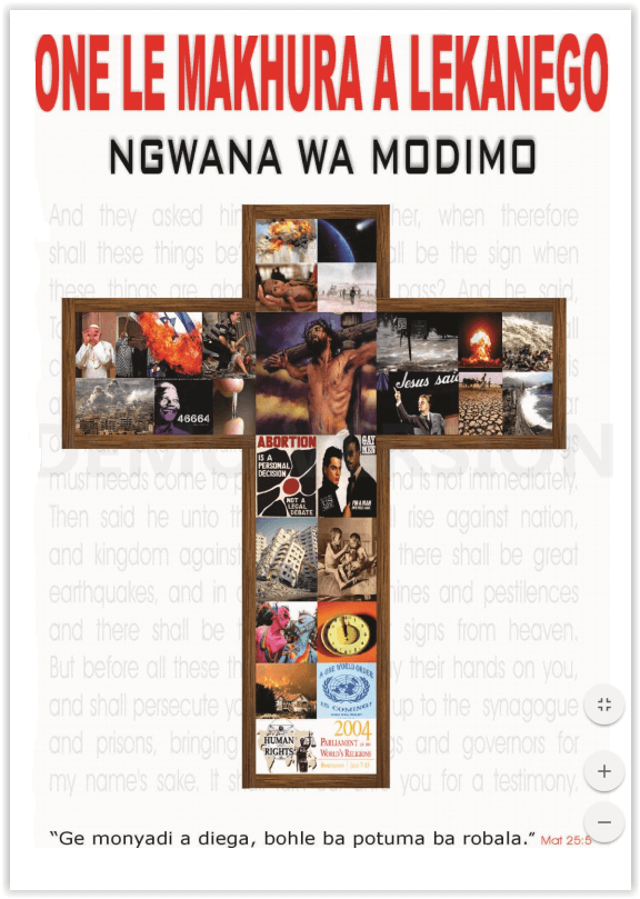 woo o ratago go ba isa efapanong. Ba feletsa ba ikgothatsa le go ikaga go ena gore ba ipapole. Ba re ke bona ba Modimo empa ba bjalo ka lefase, ba bolela bjalo ka lefase ebile badira bjalo ka lefase 1Joh 2:15-17 Ba ba bjalo ke bakriste ba go tekateka bar ego “ke mohumi ebile ga ke nyake selo, ebile o sa tsebe gore wa Magodimong o re lwetse mathateng ba a re sireletsa mathateng ohle, bo diding; bo fofung le go itlhobolela Kut 3:14-22. Bokgethwa Ge o ka tswalwa lefsa moya o mokgetwa o tla go etella pelo. Kgat ye e latelago ke go fihlella ntlha yeo o hwelago wena le tsa lefase. Bar 12:1-2 ipolele bjalo ka Paulo “ ke bapotswe le Kriste bjalo ga e sale nna yo a phelago, empa Kriste yo a phelago go nna” “Bag 2:20 Modimo a ka go somisa gore o thuse ge fela o lokolotswe. Bohle bao ba kolobe ditswego ke Morena Jesu ba kolobeditswe lehung la gagwe. Bar 6:3 Kolobetso ke kokwane ye bohlokwa phenyong ya bophelo bjo bo kgethwa. Ga se batho ba bantshi bao ba fihlelelago ntlha ye gobane ba kolobeditswe e sale bana ebile ga ba ne nnete gorekolobetso e tsena kae, ba bantshi ba kolobeditswe ele ba bagolo empa ga se ba tswalwe lefsa ba fetoga Ka kolobetso ya gago o nyalana le Kriste ebile tsatsi le lengwe o ka se kgaogane le yena le ka tsatsi le tee Bah 6:1-6 Ka kolobetso bo wena bja gag obo tla bolokwa le Yena Bak 2:2-12 ebile moya o mokgethwa o tla go etella pele go ya seetseng. Bjalo go tla songwa ka dibe bjalo ka lehloyo, bogale, go hloka tshwarelo lesebo, boikana, karogano, pefelo, maaka, bjalo bjalo. Ge o khunama ebile o eba mofenyi, o tla ba bjalo Kriste, seo ke bokgethwa, seo ke go kgoboketsa makhura. Ga se mesomo yeo e go lokafatsago k age o hwetsa phenyo mola, mesomo eno e tlisa tumelo e le tee e ka se go pholose Jam 2:14 Ge o ikhwetse ka nnete, o beile dibe tsa ga go tsohle aletareng, wa di tlogela moo, Modima o tla dira mosomo o mogolo wa kgaugelo go wena o bitswago tlhatswisiso tlholegong ya sebe le tswaro yeo sathane ago swerego ka yona. Bar 6:22 Nakong ye o ka se ba lebagwera ba bantshi lefase le tla go hloya Mat 10:22. Ebile, otla lebelela, bolela, gopola wa dira tsohle tse lebanego le lefase 1 Joh 3:1. Go mahlatse ba bantshi ga ba fihlelele ntlha ye ka gobane ga se ba ikhwele. Eba ba kriste bao ba phelago lebakanyana fela mme ba wa, ga ba eny we dienywa, ebile ga go ne barutiwa ba Morena – Mat 28:19